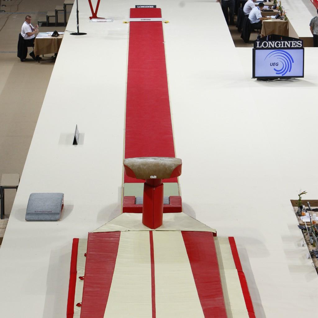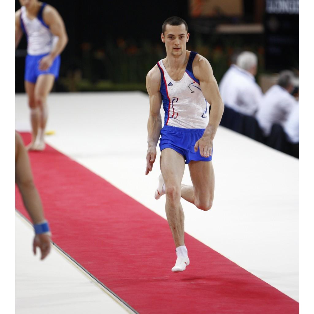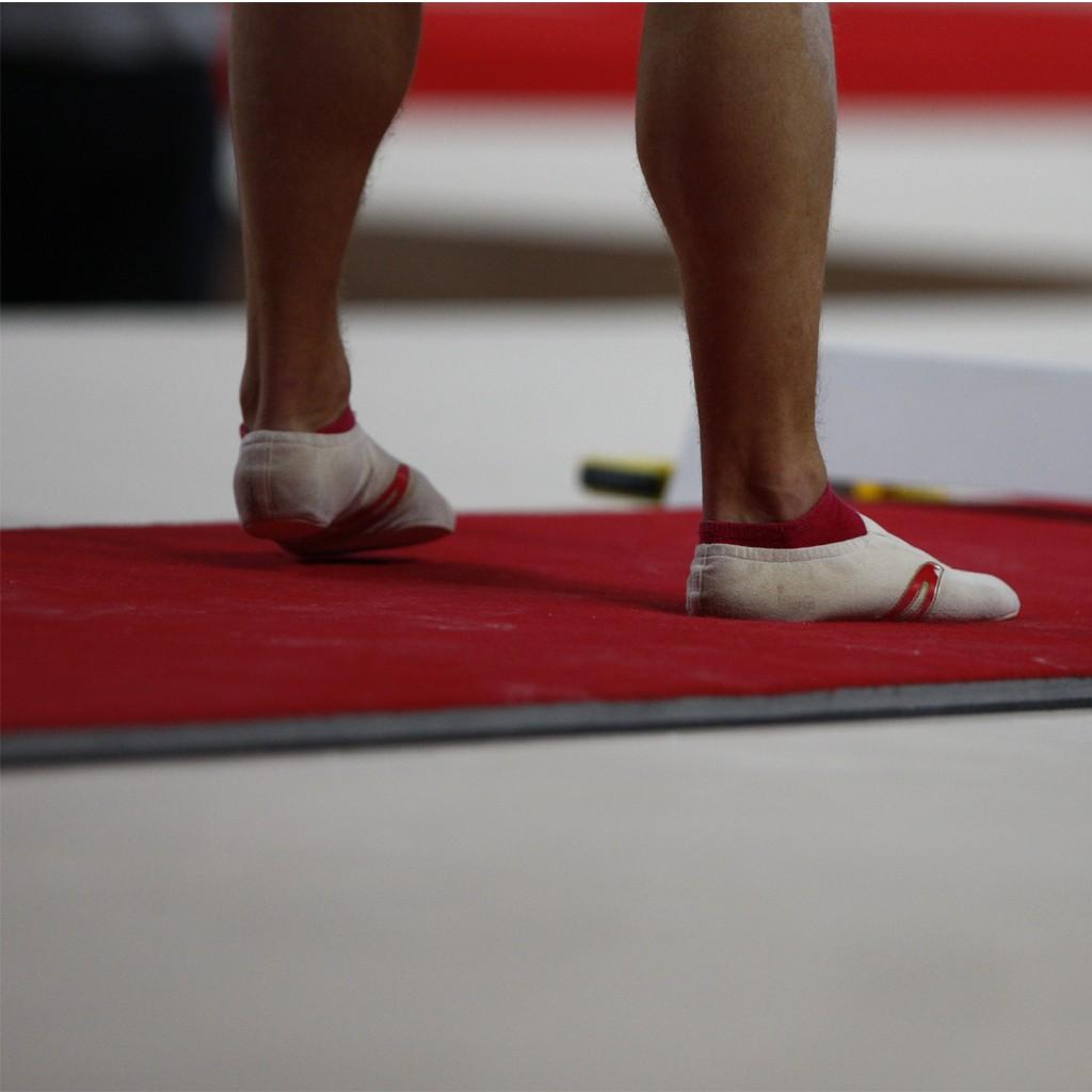 Gymnova competition runway. Dimensions 25 x 1 m. Thickness 25 mm. Made of a flame pattern carpet bonded to dynamic foam with non-slip base.