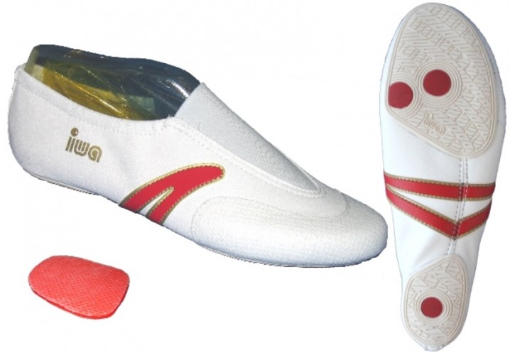 IWA telinevoimistelutossu vahvistetulla kärkiosalla. Kaksiosainen pohjallisen ansiosta parempi askeltunto. Pitävä liukuasetepohja päkiän ja kantapään kohdalla. Kantapäässä iskuja vaimentava punainen pehmeä IWA POWERGEL-tyyny. Materiaali mikrokuitu. Tossumalli on hieman normaalia pienempää mitoitusta.