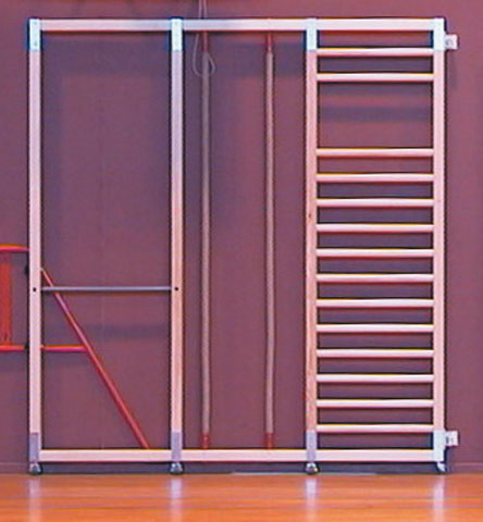 3-osainen seinä, jossa rekkitanko, kiipeilynaru sekä puolapuut.