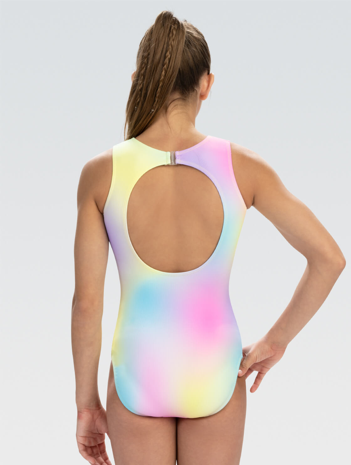 Pastel Horizon Rib voimistelupuku on valmistettu ribbikankaasta, jossa on pehmeä pastellisävyinen kuvio. Värit  pinkki, keltainen, minttu ja sininen, sulautuvat kauniisti toisiinsa luoden rauhallisen ja unenomaisen ilmeen.